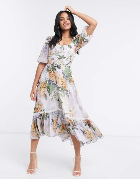 Wedding Guest Dress With Frill In Grey Floral Print By Ooh La La