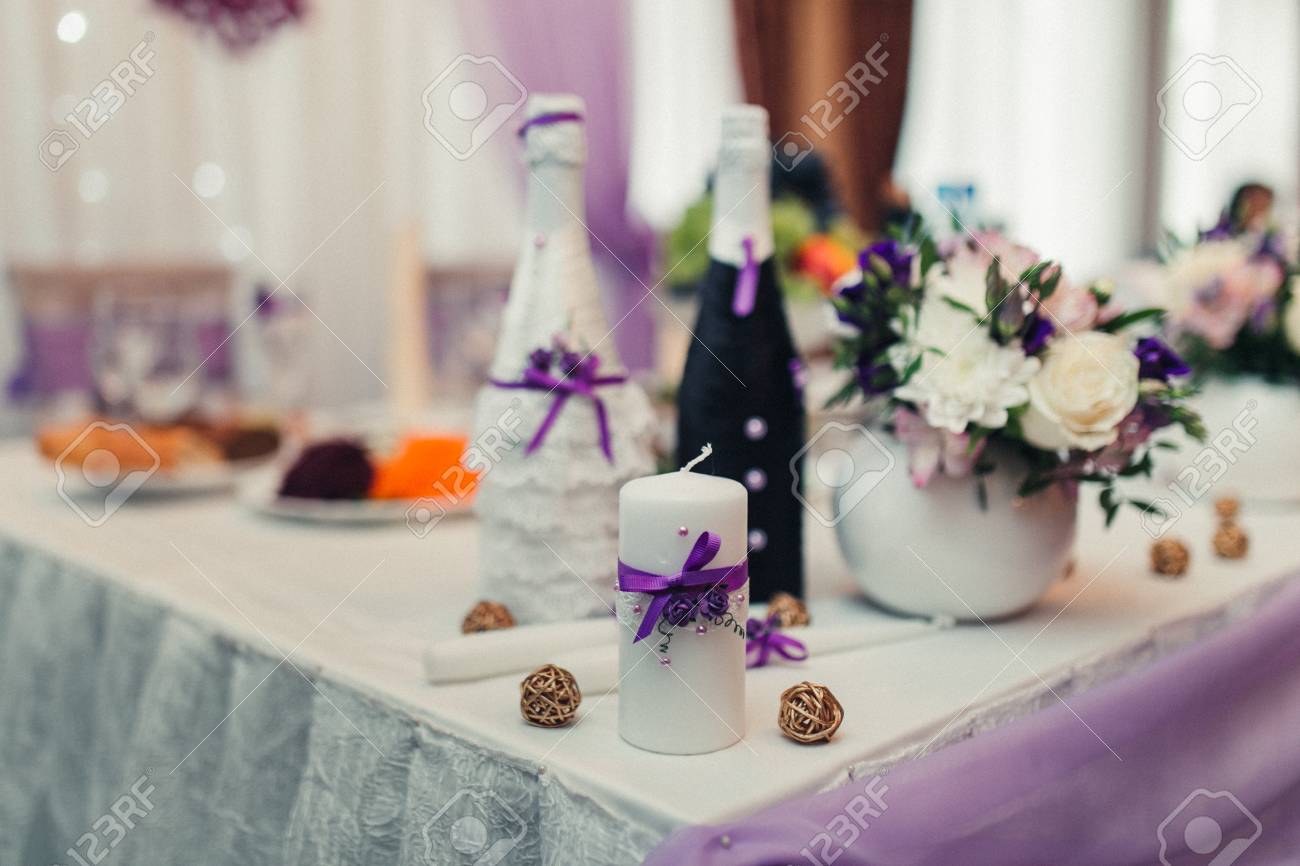 Wedding Table Decoration With Candle In Lilac Color Stock Photo