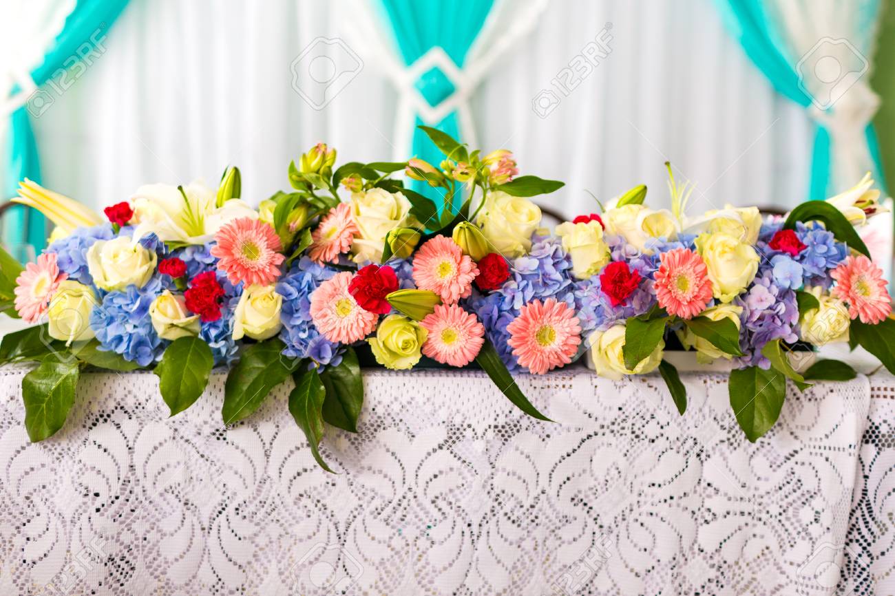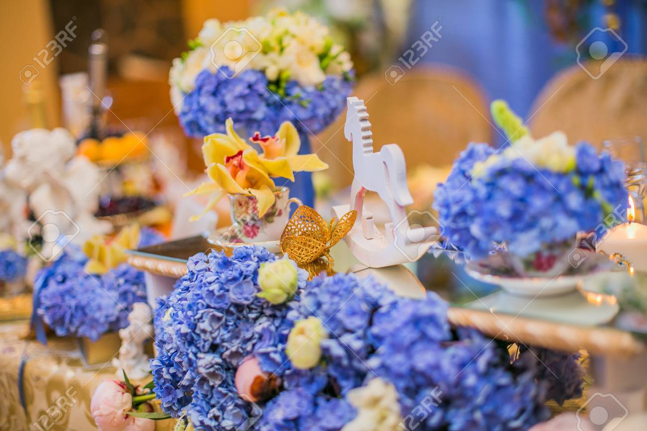 Wedding Table Decoration With Beautiful Blue Flowers Stock Photo
