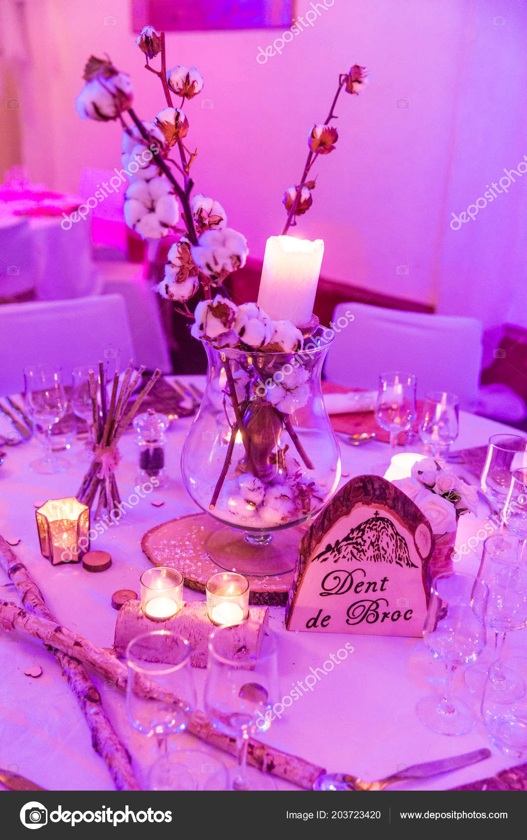 Wood Wedding Table Decoration Candle Purple Lighting Stock Photo